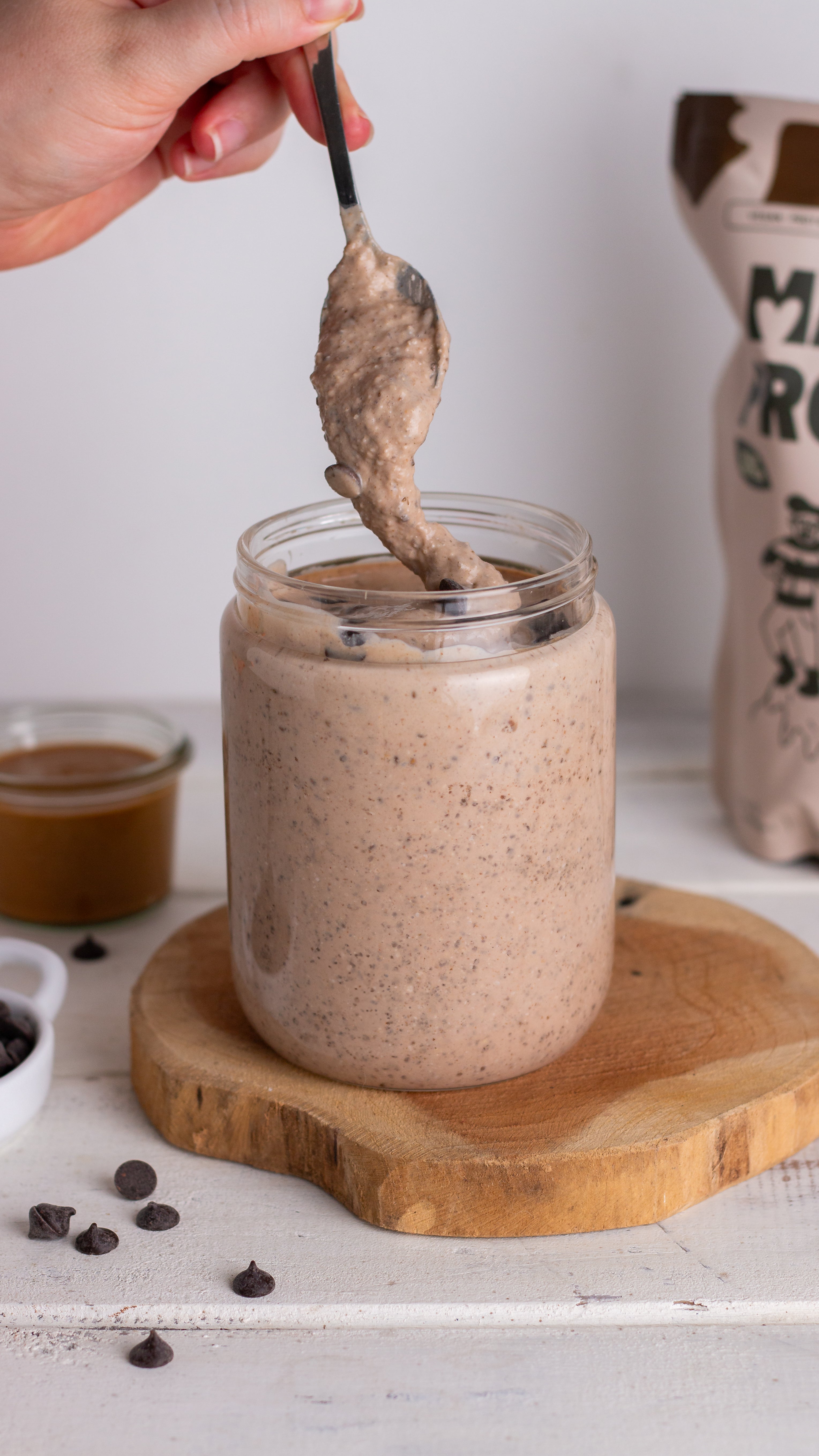 40g de flocons d'avoine 10g de graines de chia 2 scoops de maisons protéine 150ml de lait végétal (amande, avoine, soja..) 100g de yaourt végétal (soja, coco, amande..) Toppings au choix